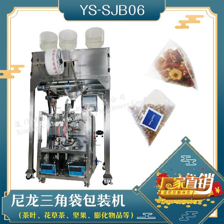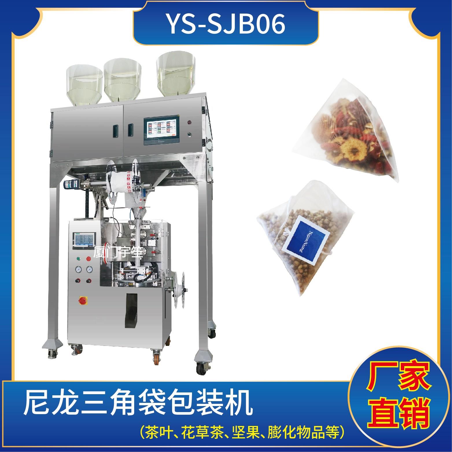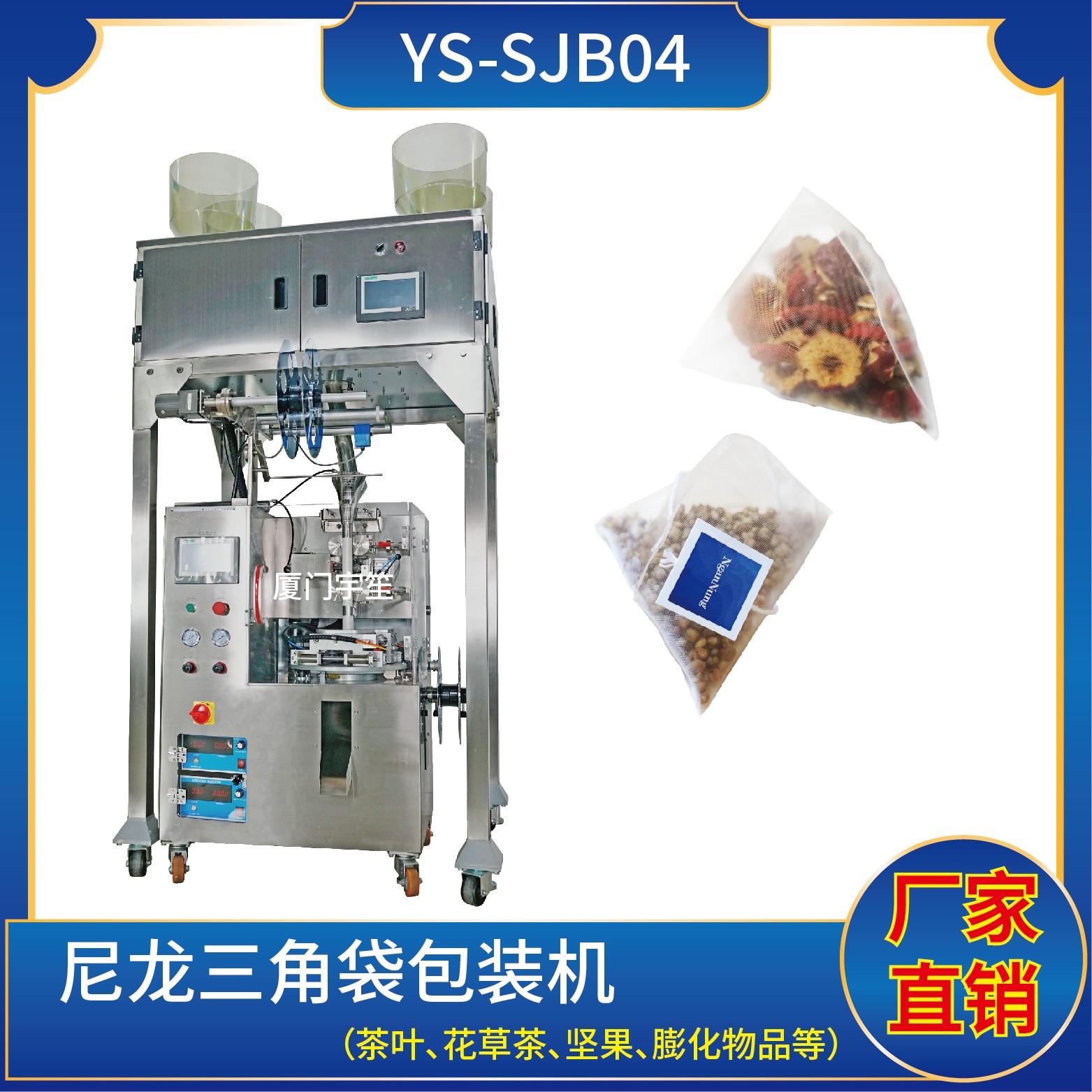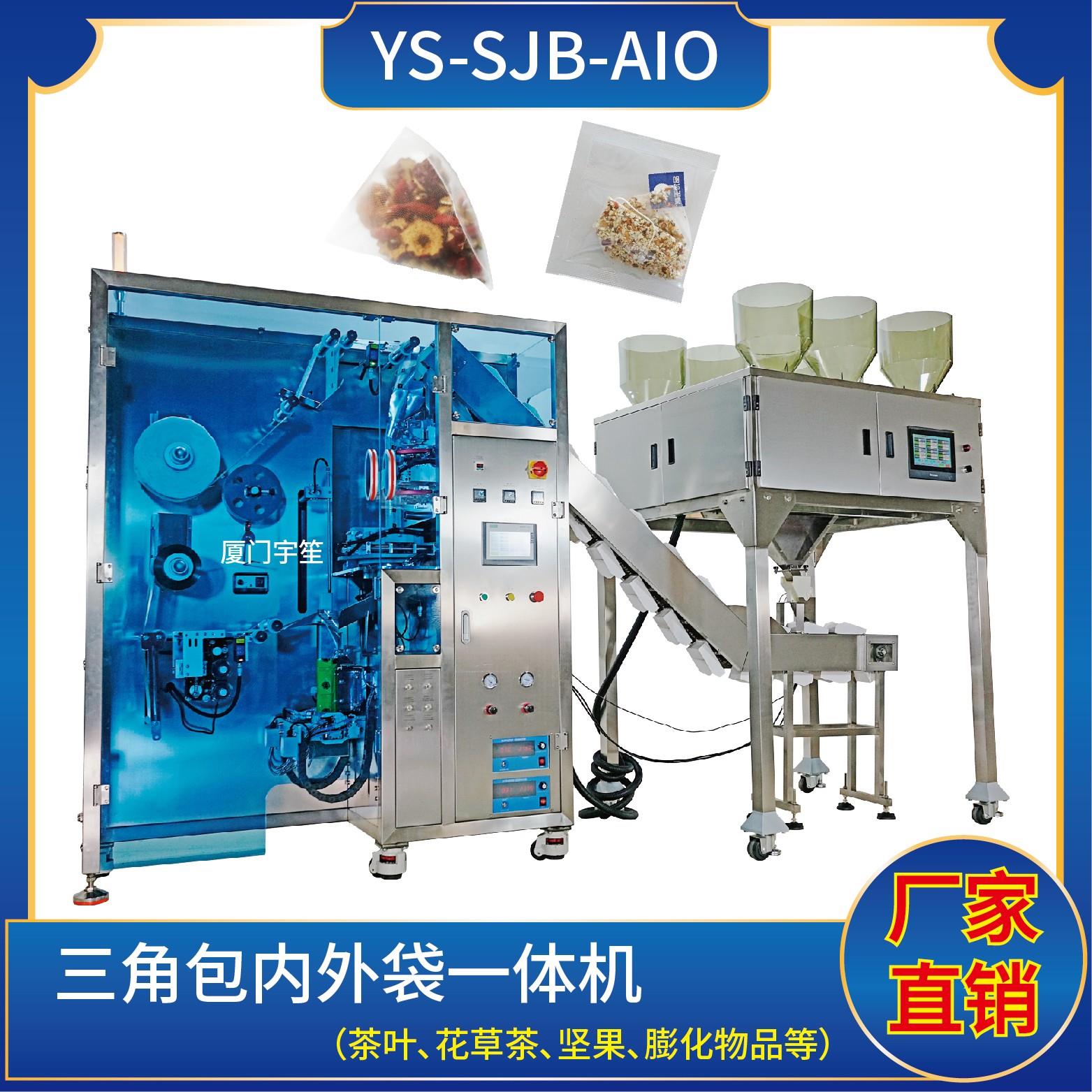YS-SJB-AIO 三角包內(nèi)外袋一體機(jī)特 點(diǎn) 1、適用于綠茶、紅茶、花茶、咖啡、中國(guó)茶、健康茶、中藥茶、顆粒等。2、可用于平面袋包裝、三角立體包裝等形式包裝袋。3、整機(jī)可自動(dòng)完成上料、計(jì)量、制袋、封口、切斷、計(jì)數(shù)、成品輸送等功能。4、選用進(jìn)口超聲波封口,電子稱計(jì)量下料方式,封口牢固,下料準(zhǔn)確。5、包裝材料:尼龍、P…