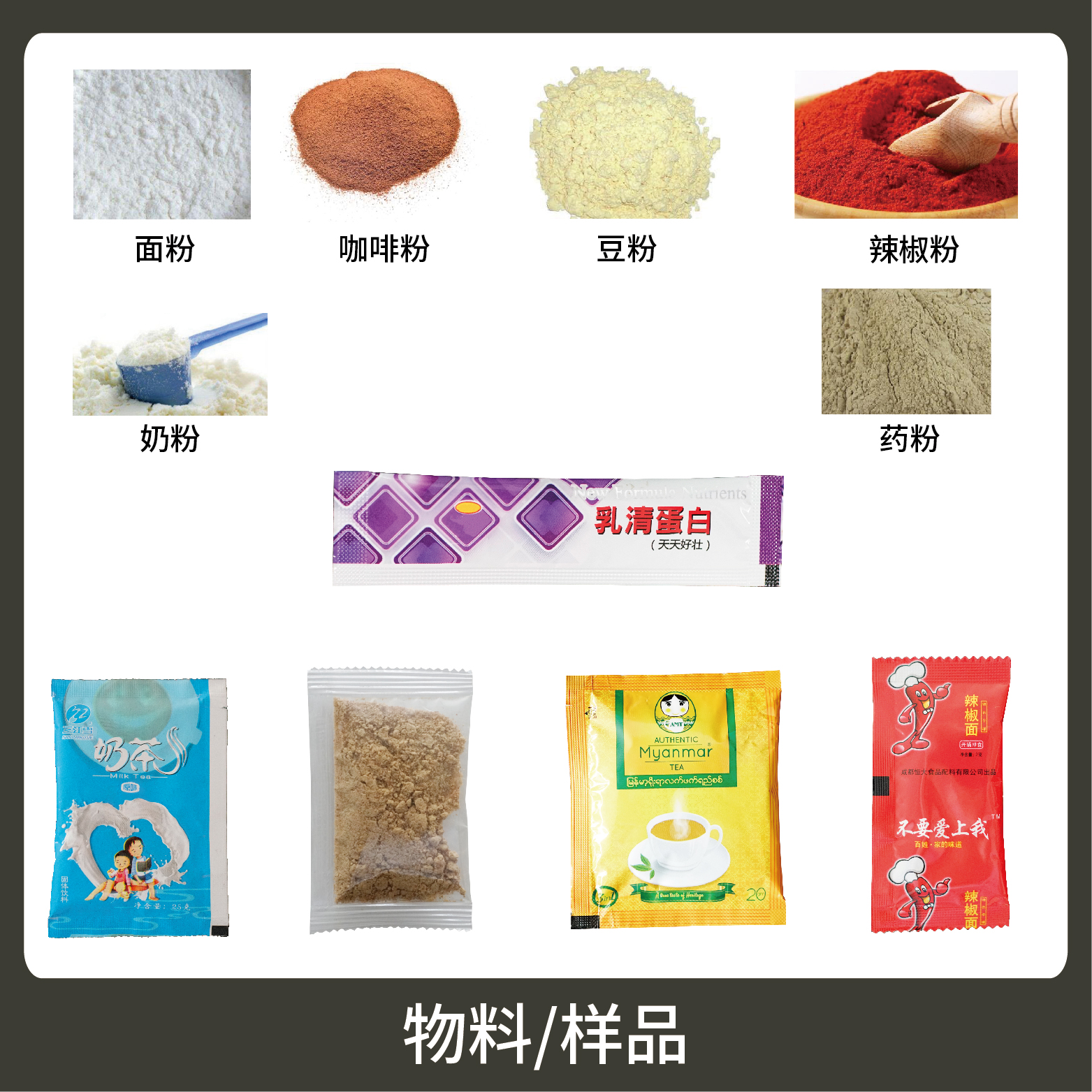 適用于食品、醫(yī)藥、化工、化妝品行業(yè)中顆粒、粉劑、液體、醬料等物品的計(jì)量包裝,如:干果、種子、辣椒面、咖啡粉、谷物粉、辣椒油、牛奶等。